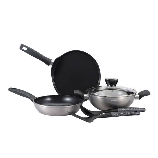 - Bergner Carbon TT 6 Piece Cookware set Kadai with Lid, Fry Pan, Pancake Pan, Kitchen Tools Induction Base Silver