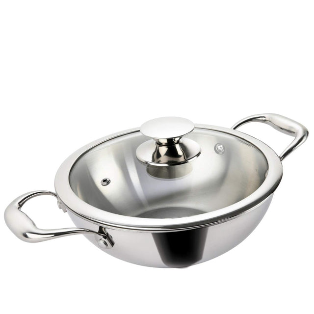 Alda Alda 2.2 LTR Vitale Tri-Ply Stainless Steel Wok Pan Kadhai with Glass Lid (22 cm)