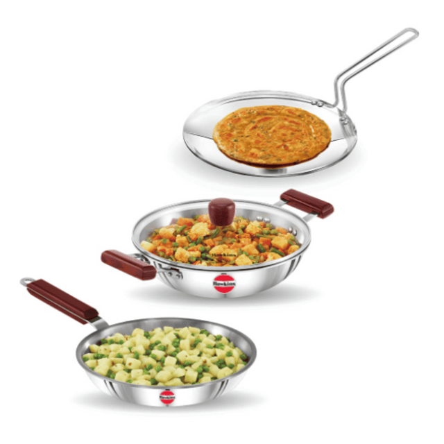 The cookware set consists a Tava, Frying Pan and Deep-Fry Pan with stainless steel lid to cater to most of your cooking needs