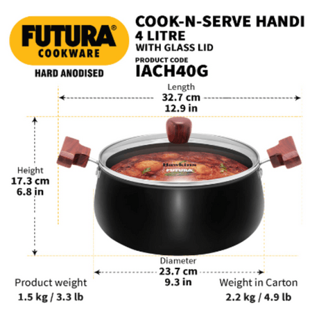 Hawkins Futura 4 Litre Cook N Serve Handi, Hard Anodised Biryani Handi with Glass Lid, IACH40G