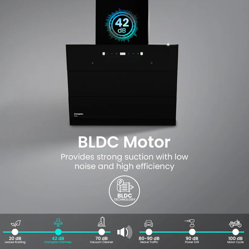 Upgrade your cooking experience with the Crompton Eliteo Chimney, designed for modern kitchens that demand both performance and style. Equipped with advanced features like Intelligent AutoClean, Smart On, and Gesture Control, this chimney takes the hassle out of maintenance and operation. Its powerful BLDC motor ensures high suction capacity with energy efficiency, while the wide surface area captures maximum smoke and fumes in one go—keeping your kitchen fresh and healthy. With Crompton Eliteo, you get a perfect blend of technology, convenience, and safety.