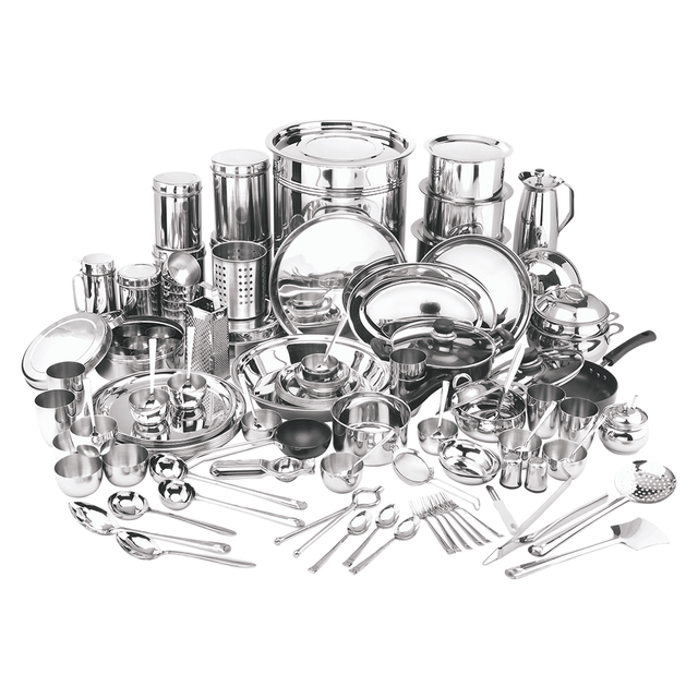 The Kraft Parivar Dinner Set (111 Pcs) is a complete family dining solution designed to bring elegance, functionality, and convenience to your table. Crafted from premium quality stainless steel, this set is durable, rust-resistant, and built for long-term use. With an extensive 111-piece collection, it includes everything you need for serving and dining — plates, bowls, glasses, serving spoons, and more — making it perfect for daily use as well as festive occasions and family gatherings. Its mirror finish and traditional yet modern design enhance your dining experience, while the easy-to-clean nature makes it low-maintenance.