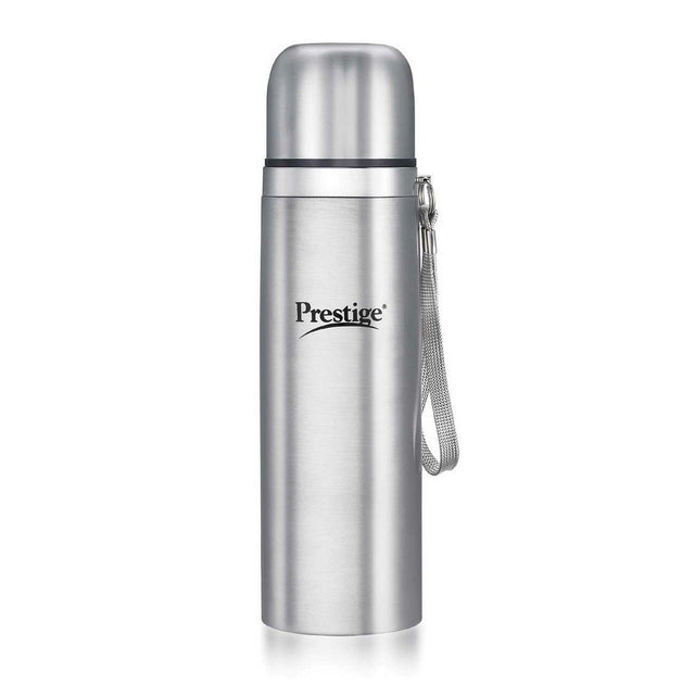 Introducing the stylish and easy to carry Prestige Thermopro vacuum flask. This superior vacuum insulated flask keeps liquids hot or cold for hours so you don 檛 have to worry about re-heating or re-cooling again and again.Made of 304 grade stainless steel, the Prestige Thermopro vacuum flask keeps your liquids safe with no contaminations. With the features like spill proof lid lock, wide mouth, and a specially designed carrying pouch, the Prestige Thermopro Vacuum Flask is a must have accessory for any home or office.