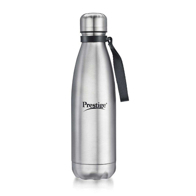 Prestige Thermopro stainless steel water bottle! This stylish water bottle made and 304 grade stainless steel allows you to carry clean & safe water wherever you go. It comes with Double walled vacuum insulation and a Copper layer that keeps your water Hot or Cold for hours so that you don 檛 have to worry about re-heating and re-cooling again & again. With features like 304 grade stainless steel body and lid, carrying strap etc, the Prestige Thermopro water bottle is an indispensable accessory for your home or office.