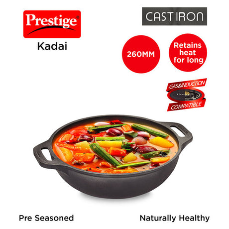 Prestige Cast Iron Scratch Resistant Round Base Kadai, 26cm (Black) 30561