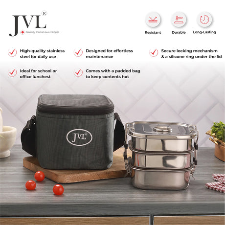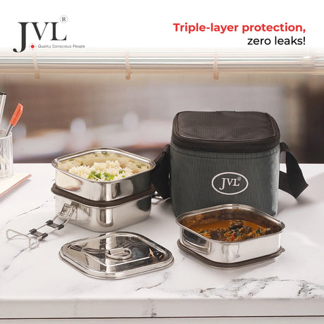 JVL Stainless Steel Triple Layer Square Leak Proof Lunchbox - Small (STLP 1)