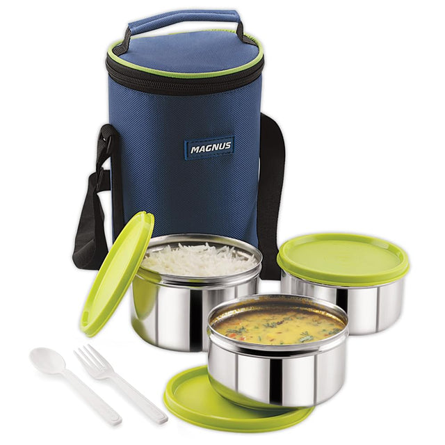 Magnus Alfa-3 Stainless Steel Lunch Box Set – 3 Leakproof Containers with Insulated Bag | Air-Tight & Safe Tiffin for Office, School & Travel | Ideal for Men, Women & Kids (Blue)