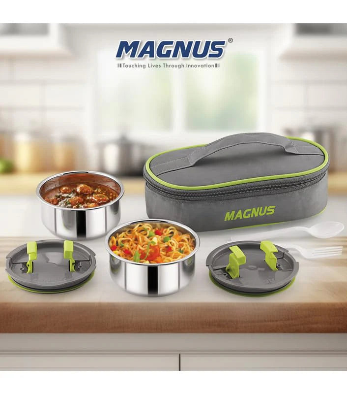 The Magnus Olive-2 Stainless Steel Lunch Box Set is a practical and stylish solution for everyday meal storage at school, office, or on the go. Featuring two premium stainless steel containers with airtight, leak-proof lids, this set ensures safe transport of curries, gravies, and dry snacks without spills. The included insulated carry case helps keep your food warm and fresh for longer, making it ideal for professionals, students, and kids. With microwave-safe containers and a compact design, the Magnus Olive-2 is a smart and sustainable alternative to disposable lunch solutions.