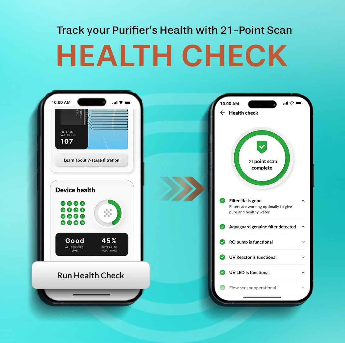 • RO + UV Purification: Ensures removal of dissolved impurities, chemicals, heavy metals, and harmful microorganisms.