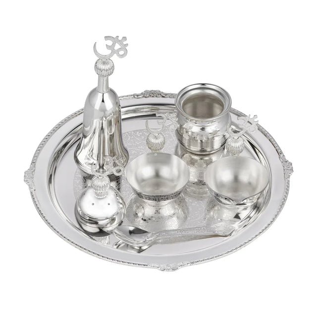 The Pipal Om Puja Thali Silver 7 Pcs Set is an elegant and complete worship set designed to enhance your daily puja rituals and festive ceremonies. Crafted from premium silver-finished metal, this thali exudes a traditional yet graceful look, making it a perfect addition to your home temple. Adorned with the auspicious Om symbol, it symbolizes peace, prosperity, and devotion. The set includes 7 essential items required for rituals, making it both convenient and spiritual. Ideal for daily worship, festive occasions, and as a thoughtful gift for loved ones.