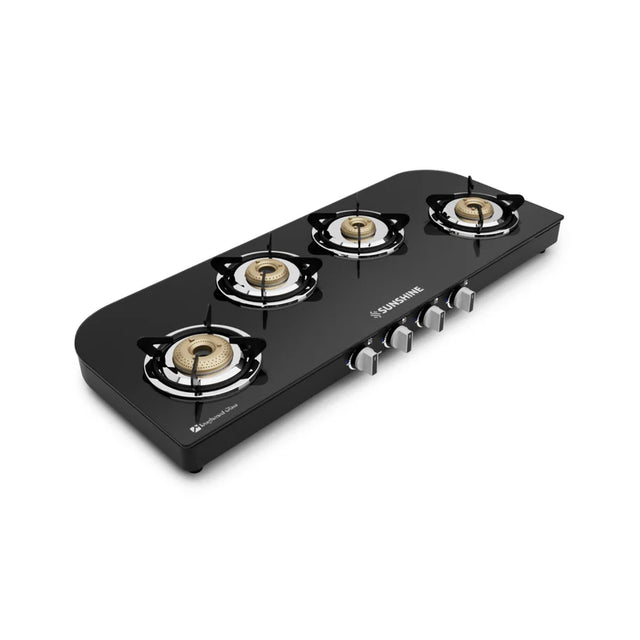 The Sunshine Olympic Gold 4 Burner Gas Stove Manual Ignition Glass Top is designed to deliver a perfect balance of luxury, efficiency, and everyday practicality. Equipped with four high-efficiency brass burners in a 1 jumbo, 1 medium, and 2 small configuration, it ensures faster, even cooking and allows you to prepare multiple dishes simultaneously with ease.
