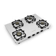 Equipped with four high-efficiency brass burners in a balanced configuration (1 jumbo, 1 medium, and 2 small), it ensures uniform heat distribution and enables multi-tasking with ease. The manual ignition system provides reliable, battery-free operation, while ergonomic metal knobs allow precise flame control. Sturdy pan supports ensure stability for all cookware sizes, and removable drip trays make cleaning quick and convenient.