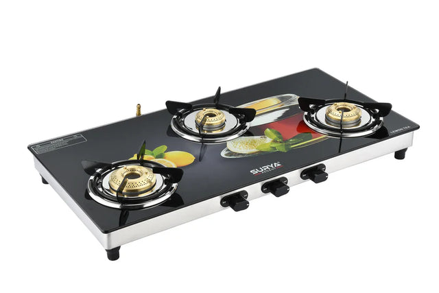 The Surya Accent 3B Lemon Tea GT LC (Designer) is a stylish and efficient 3-burner gas cooktop designed for modern kitchens that value both form and function. With a designer finish, this model brings a refined aesthetic component to your kitchen — its lemon-tea inspired look provides a unique visual appeal. The “GT” designation indicates high-performance burners that deliver good flame strength, while “LC” suggests a sleek, low-profile or glossy top surface.