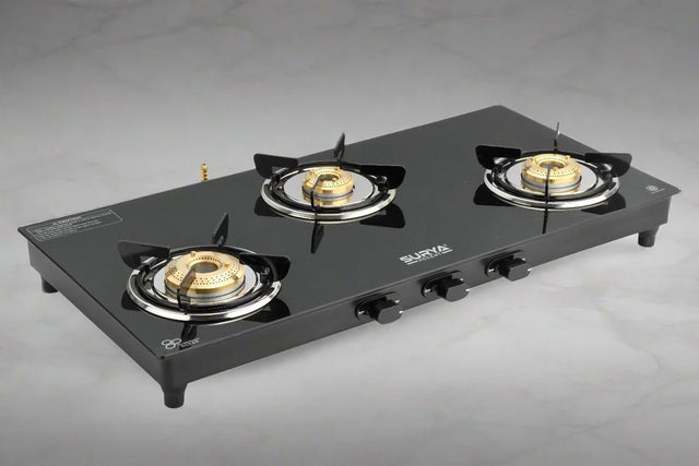The SURYA ACCENT 3B SMART GT SS DT is a three-burner cooktop designed for everyday multi-dish cooking in a compact and efficient form factor. It features a stainless-steel (SS) top finish with a durable drip tray (DT) for easy cleaning and maintenance. With the “SMART GT” burner configuration, the unit is built to deliver reliable performance and flexibility in a modern Indian kitchen.