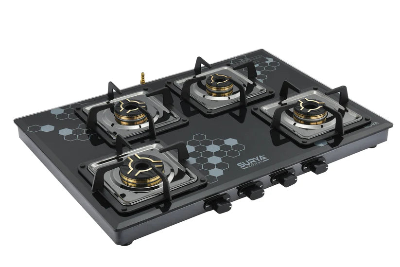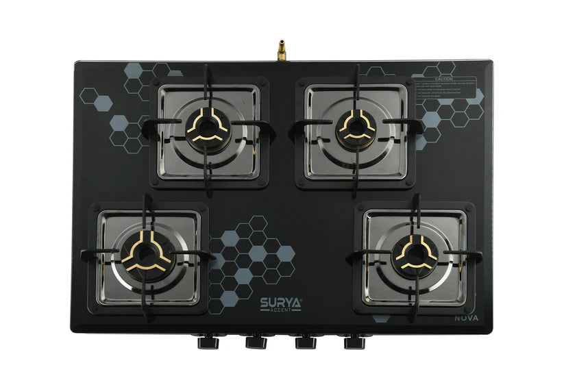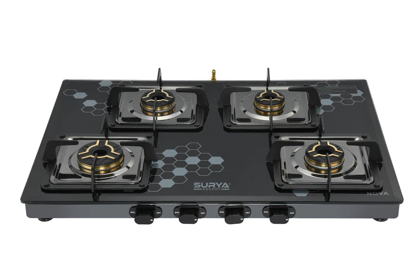 The SURYA ACCENT 4B NOVA SS GT is a premium four-burner cooktop tailored for modern Indian kitchens requiring both capacity and aesthetic appeal. Built with a stainless steel (SS) finish and part of the NOVA series, this model offers large-family cooking flexibility with four burners.