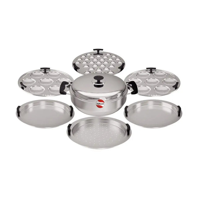 Make steaming, cooking, and serving effortless with the Tuffware Multi Kadai with 6 Plates – a versatile kitchen essential for preparing a variety of traditional Indian dishes. Crafted from high-quality stainless steel with a heavy-gauge base, it ensures even heat distribution for consistent cooking results. This multi kadai comes with 6 interchangeable plates, allowing you to steam idlis, dhoklas, modaks, momos, and more, all in one convenient cookware set. Its sturdy handles ensure safe handling, while the mirror-finish body adds a touch of elegance to your kitchen. Perfect for everyday use or festive cooking, the Tuffware Multi Kadai offers both functionality and durability.