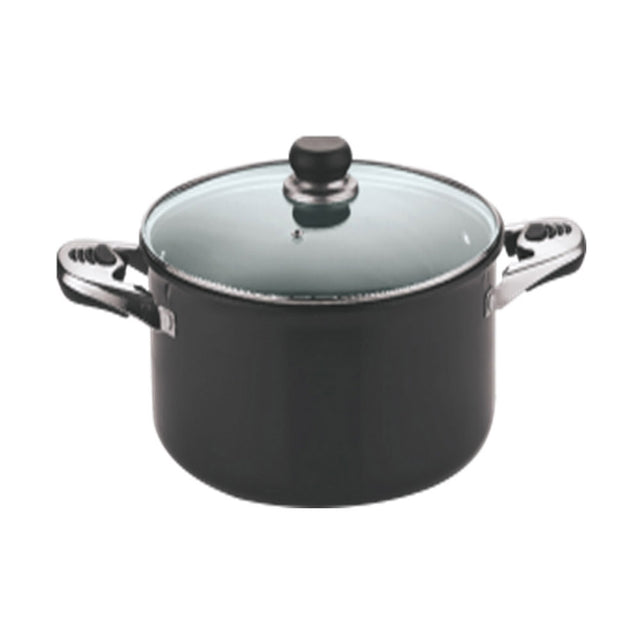 - This hard anodized saucepot comes with the convenience of a tempered glass lid