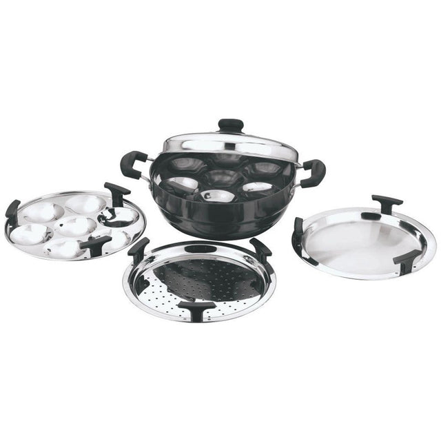 The Multi Kadai comprises a set of 2 idli plates, 2 dhokla plates, and a patra plate. It can be used to steam idlis as well as cook vegetables and fry food.