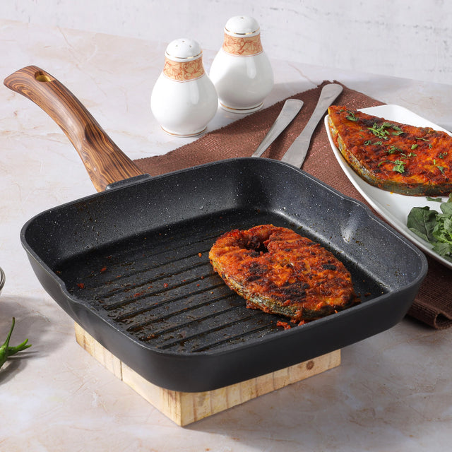The Zest Plus Die Cast Aluminium Grill Pan 24 cm is a premium cookware piece designed for healthy and flavourful grilling indoors. Made from heavy-duty die-cast aluminium, it ensures even heat distribution for perfectly seared results. Its high-quality non-stick coating allows low-oil cooking and effortless food release, while the deep grill ridges create authentic char lines and help drain excess fat. Ideal for grilling vegetables, meats, sandwiches, and seafood, this pan brings the barbecue experience to your kitchen. The ergonomic, heat-resistant handle ensures a secure grip, and its compatibility with gas and induction cooktops adds versatility to your cooking.