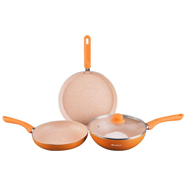 The Kitchen is the heart of the home. Wonderchef Royal Velvet Plus Set of pans, adding warmth to your cooking experience. Wonderchef Cookware Set of 3 includes a Fry Pan, Wok and Dosa Tawa. Beautifully designed nonstick pans with marble coating inside and vibrant color outside, complement the entire look. The perfect gift option for special or festive occasions.