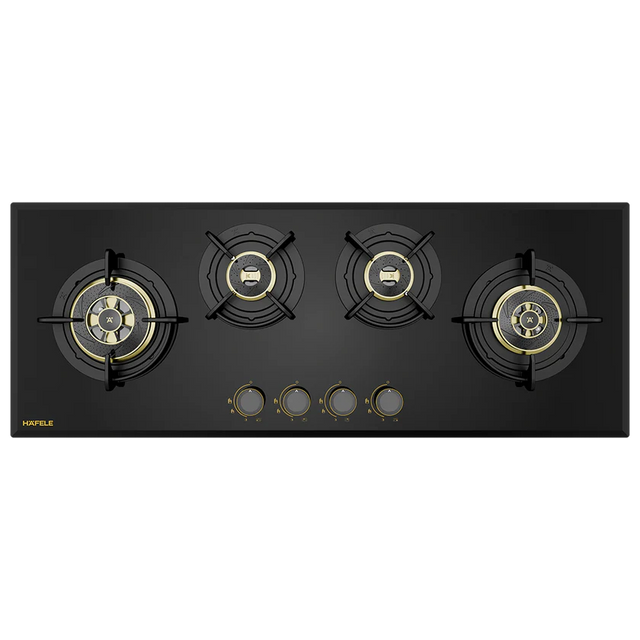 Elevate your kitchen experience with the Hafele 100 cm 4 Burner Hob from the Altius Plus Series, crafted for efficiency, durability, and modern style. This built-in hob features a fully sealed construction to prevent spillage and enhance longevity, along with premium brass burners designed for powerful and even cooking. Its cordless design ensures consistent performance even during power cuts, while the industry's first Insta Ignition feature offers the fastest ignition even in cold weather. Finished with a stunning 8 mm tempered bevelled glass panel and luxurious golden-finish metal knobs, the hob combines safety, convenience, and aesthetics to create the perfect cooking solution for your modern kitchen.