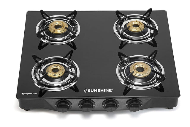 The SUNSHINE Apollo 4 Burner Gas Stove Manual Ignition is designed for modern kitchens that demand performance, elegance, and efficiency. With four high-quality brass burners, this cooktop allows you to cook multiple dishes at once — ideal for large families and gatherings. The toughened glass top not only enhances durability but also adds a stylish, premium look to your countertop. Equipped with manual ignition, sturdy pan supports, and ergonomic knobs, the Apollo 4 Burner Gas Stove delivers superior functionality with everyday convenience. Built to last, it combines energy efficiency with a sleek design to make your cooking experience smoother and faster.