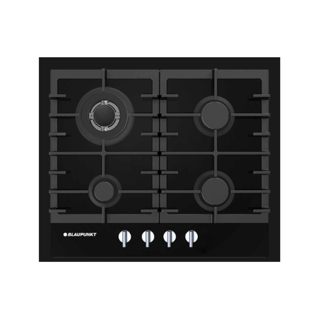 Blaupunkt By Hettich Gas Hob, 5GB 62191IN, Black Glass, Hardened, 4 Full Brass Burner, Front Control Knob, Cast Iron Pot Carrier