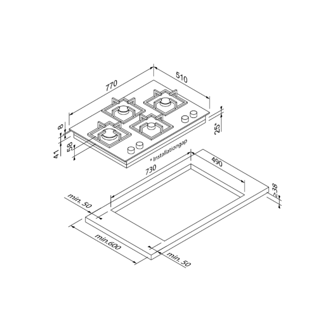 Blaupunkt By Hettich Gas Hob, 5GH 75BB490, Tempered Black Glass 8 MM, 4 Full Brass Burner, Auto Ignition, Cast Iron Pan Supports, Flame Failure Safety Device