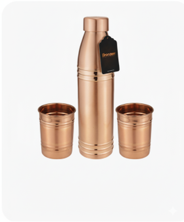 The Bronzerr DR Fancy Matt Copper Bottle Set (BZ-1012) is a stylish and health-boosting addition to your daily lifestyle. Expertly crafted from premium pure copper, this set includes a sleek copper bottle and two matching copper glasses. Designed with a distinctive DR Fancy pattern and a matte finish, it blends elegance with functionality. Copper’s natural antimicrobial properties help purify water, promoting better digestion and overall wellness. Perfect for daily use at home or office, it also makes a thoughtful and elegant gift choice.