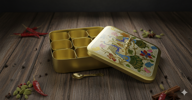 Traditional Spice Box (Masaladan): A classic, square container designed for the organized storage of essential kitchen spices.