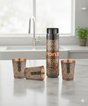 Bronzerr Retro Water Bottle & Tumbler Set (BZ - 1052) is a magnificent 3-piece drinkware set that fuses traditional utility with a sophisticated, vintage aesthetic. This collection is typically crafted from a metallic material like Copper or Brass, known for its traditional health benefits, and features a unique, antique brown/black finish. It includes one slender water bottle with a secure black cap and two perfectly matched tumblers.