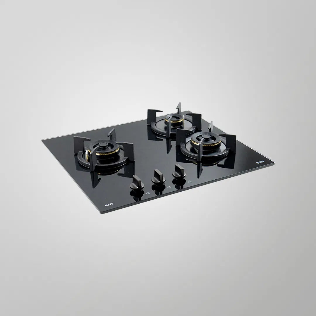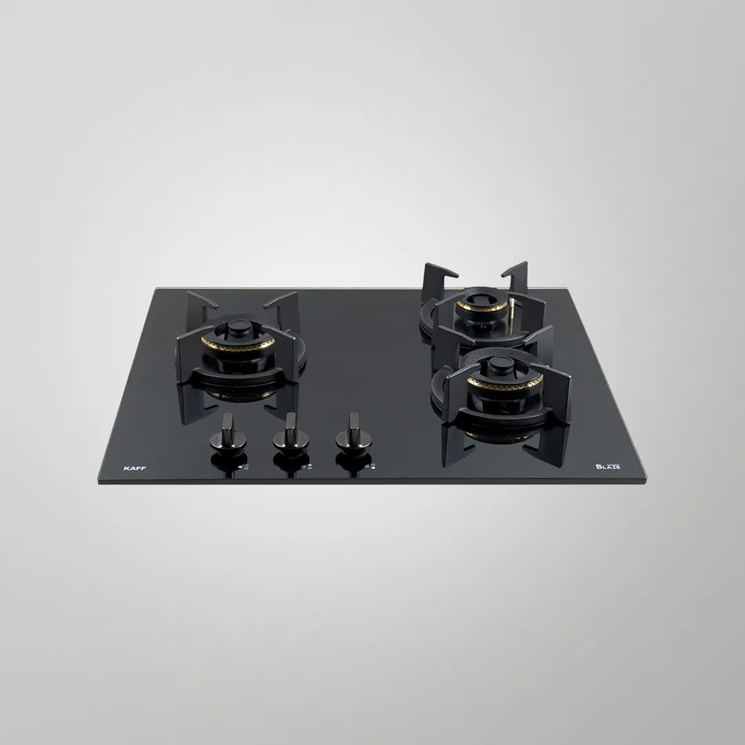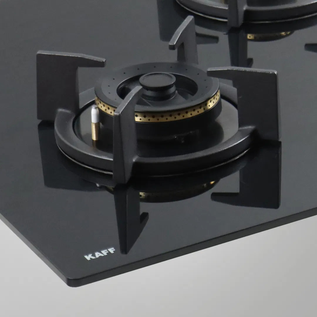 The KAFF BZ 603 built-in hob offers a perfect blend of compact efficiency and elegant design, ideal for modern kitchens. Featuring 3 high-efficiency forged brass burners coated in black—2 triple ring and 1 dual ring—this 78cm hob ensures versatile cooking with precise flame control. Its 8mm thick black tempered glass surface with round edges delivers a refined look and durability. The hob includes matt enameled pan support, matte black drip tray, and sleek design metal knobs for a premium user experience. With auto electric ignition and a built-in format, the BZ 603 is a smart, safe, and stylish kitchen upgrade.