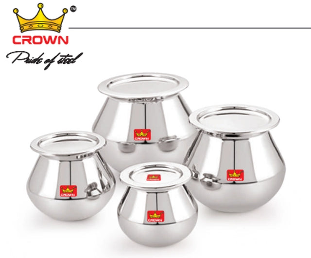 Cook and serve with tradition using the Crown Pongal Handi with Lid, crafted from pure Salem stainless steel and built with a heavy gauge for lasting durability. This premium-quality handi features a classic design, ideal for preparing traditional dishes like pongal, curries, and rice-based meals. The included lid helps retain heat and flavor, making it perfect for both cooking and serving. Available in sizes ranging from 900 ml to 4500 ml.