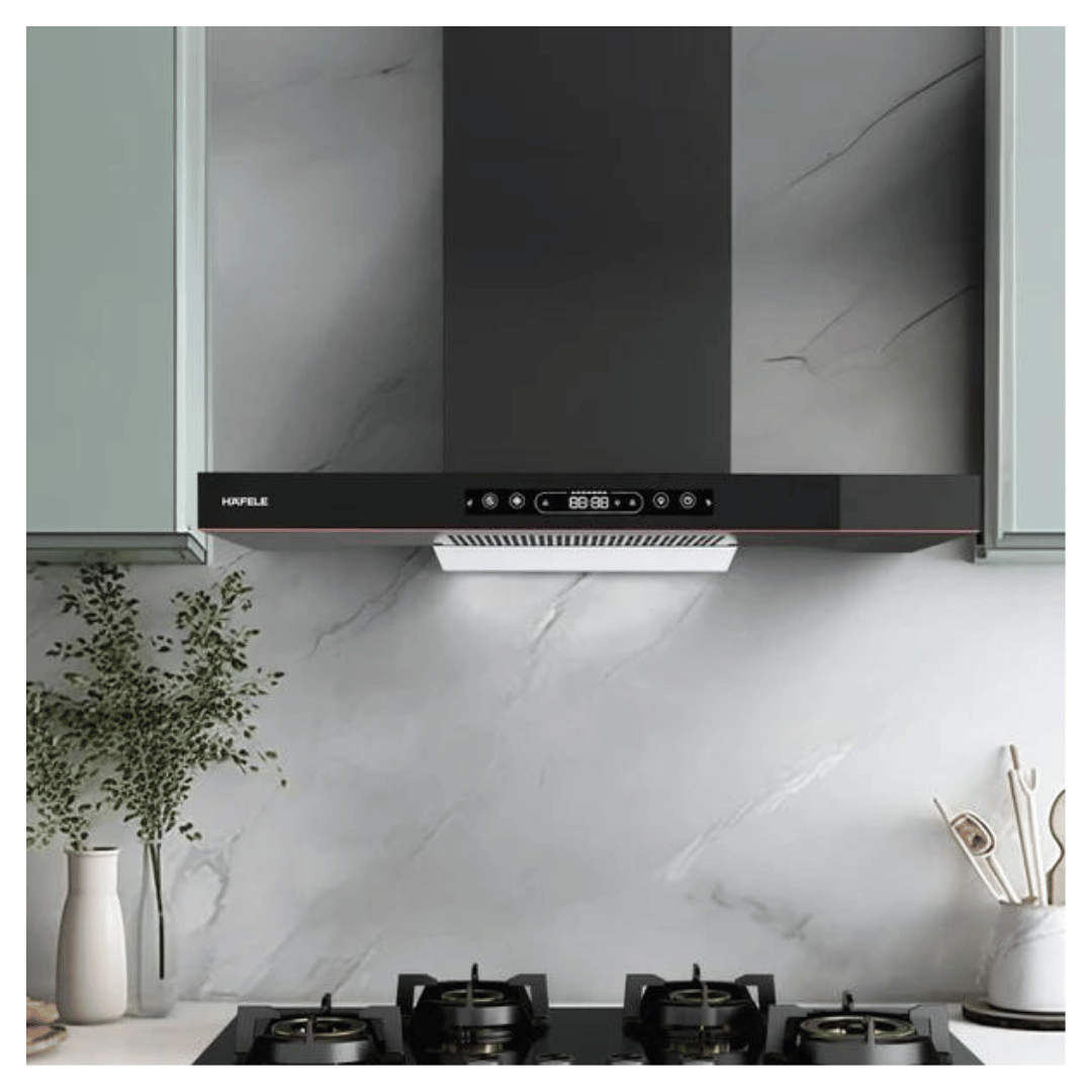 Elevate your kitchen with the Hafele Renata T-60, a 60cm wall-mounted chimney that combines advanced performance with modern design. Its sleek T-shape and black glass finish bring a touch of sophistication to any kitchen. Featuring Intelligent Heat Auto Clean technology with a 30-hour timer, this chimney offers low-maintenance operation and optimal air purification. The feather touch and gesture control system allows effortless usability, while the LCD panel ensures easy monitoring. Designed with a powerful 140W motor and 1300m³/h suction capacity, it efficiently eliminates smoke, grease, and odors. The stainless steel oil collector and LED lighting further enhance convenience and functionality.