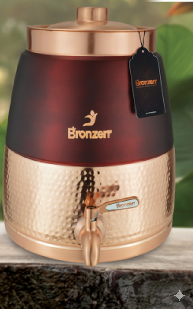 The Bronzerr Kohinoor Meadow - Cherry Copper Dispenser 12L is a stunning and functional piece of copperware, ideal for large-capacity water storage with added health benefits. This dispenser is meticulously crafted from 100% pure copper, ensuring the highest quality for your hydration needs.