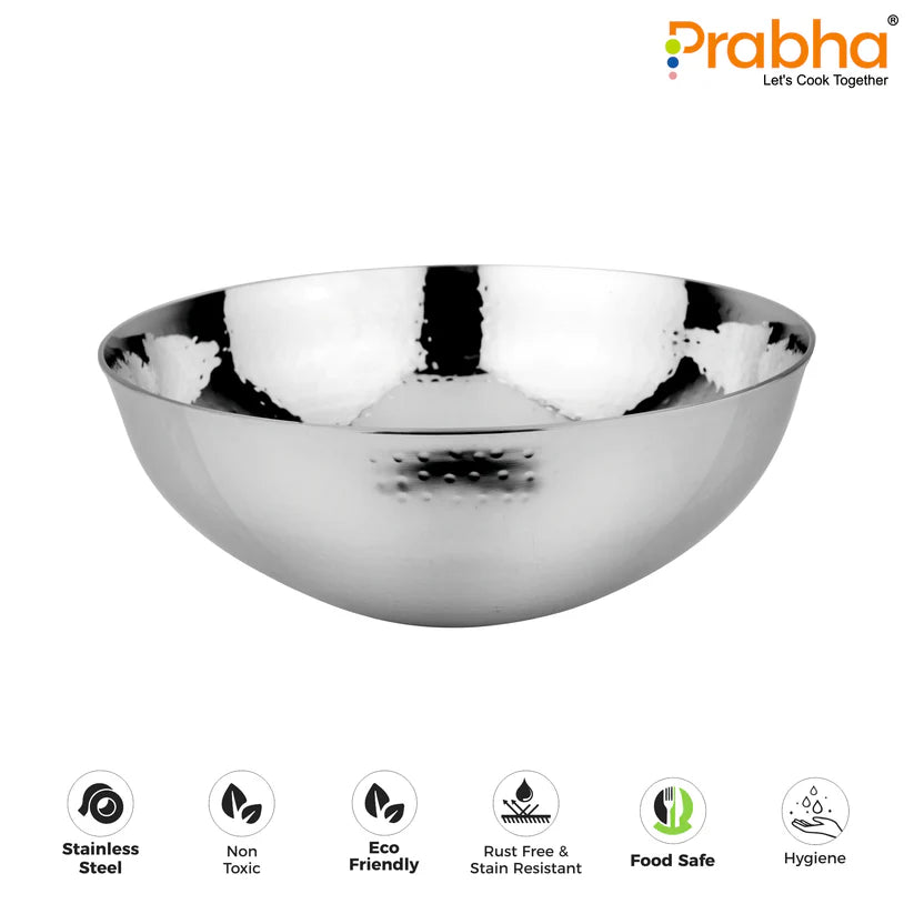 The Prabha Magnum Capsule Bottom Hammered Tasla Without Lid (1.3L, 20cm) is a compact and versatile cookware piece designed for everyday use. Its capsule bottom ensures even heat distribution for faster, energy-efficient cooking, while the hammered stainless steel finish adds elegance and durability. With a 1.3L capacity, it’s perfect for small portions, mixing, or serving.