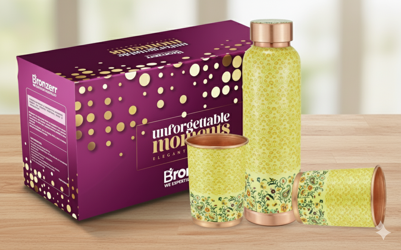 The Oreo Graphica Yellow Copper Set is a visually striking and health-focused hydration collection. Crafted from pure, premium copper, this set includes one sleek water bottle and two matching glasses. It features a unique, eye-catching design where the surface is split between a Mint Green intricate paisley pattern on the top and a bold Yellow symmetric motif on the bottom, all encapsulated by a durable enamel finish. This Graphica pattern gives the set a contemporary, bohemian aesthetic while preserving the traditional wellness benefits of drinking Tamra Jal. It’s a perfect way to inject color and style into your daily hydration ritual.
