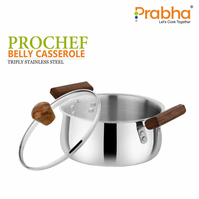 The Prabha Prochef Belly Casserole with Lid (4.8L, 22cm) is a premium cookware piece crafted for style, durability, and efficiency. Made from high-quality stainless steel, it ensures long-lasting performance and even heat distribution for perfectly cooked meals. Its belly-shaped design enhances heat circulation, making it ideal for preparing dals, curries, gravies, soups, and one-pot dishes. With a capacity of 4.8L and a sturdy stainless-steel lid, this casserole is perfect for medium-sized families.