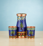 The Saanjh - Carafe Blue Copper Serving Set is an elegant and healthful addition to your home, perfect for bedside hydration or serving beverages at the table. This set features a uniquely shaped, wider copper Carafe/Pitcher and two matching glasses, all crafted from pure copper. The entire set is adorned with a rich Blue enamel base and a beautiful, traditional Tree of Life and Peacock motif, making it a stunning functional art piece. The Carafe's wide mouth makes it easy to fill and clean, while the copper construction promotes the age-old practice of drinking Tamra Jal (copper water) for well-being.