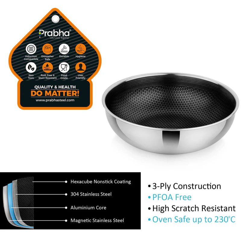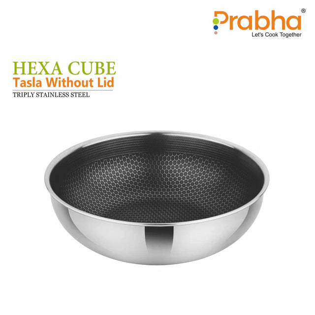 The Prabha Tri-ply Hexa Cube Tasla Without Lid (3.5L, 26cm) is a strong and versatile cookware piece designed for everyday kitchen needs. Its tri-ply stainless steel body provides fast, even heat distribution, while the Hexa Cube textured finish adds style and reduces food sticking. With a 3.5L capacity and 26cm size, this tasla is ideal for boiling, mixing, preparing curries, or cooking side dishes. Built for durability and efficiency, it’s a practical addition to any modern kitchen.