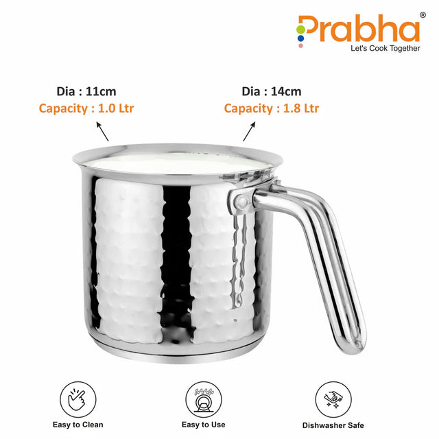 The Prabha Xenon IB Hammered Milkpot Without Lid (2.5L, 17cm) is a stylish and practical addition to your kitchen. Featuring a hammered stainless-steel finish, it offers both durability and elegance. The inner-bottom (IB) construction ensures even heat distribution, making it energy-efficient while preventing milk or liquids from sticking or burning. With a 2.5L capacity and 17cm diameter, it is ideal for boiling milk, tea, water, or preparing small portions with ease.