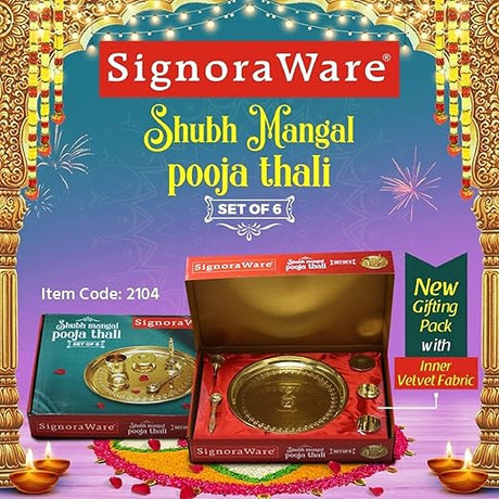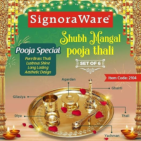 Signoraware Shubh Mangal Pooja Thali (Diya, Agardan, Yachman, Ghanti, Gilasiya) Brass